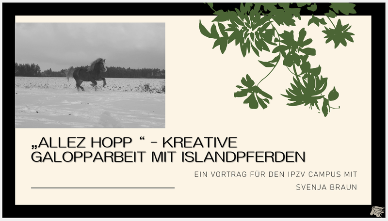 | Onlinevortrag | 10.02.2025 | Heute Abend habe ich einen IPZV Campus zum Thema "Galopparbeit gehalten und es hat so viel Spaß gemacht, für so viele Interessierte über meine Ideen und Erfahrungen zu sprechen. |